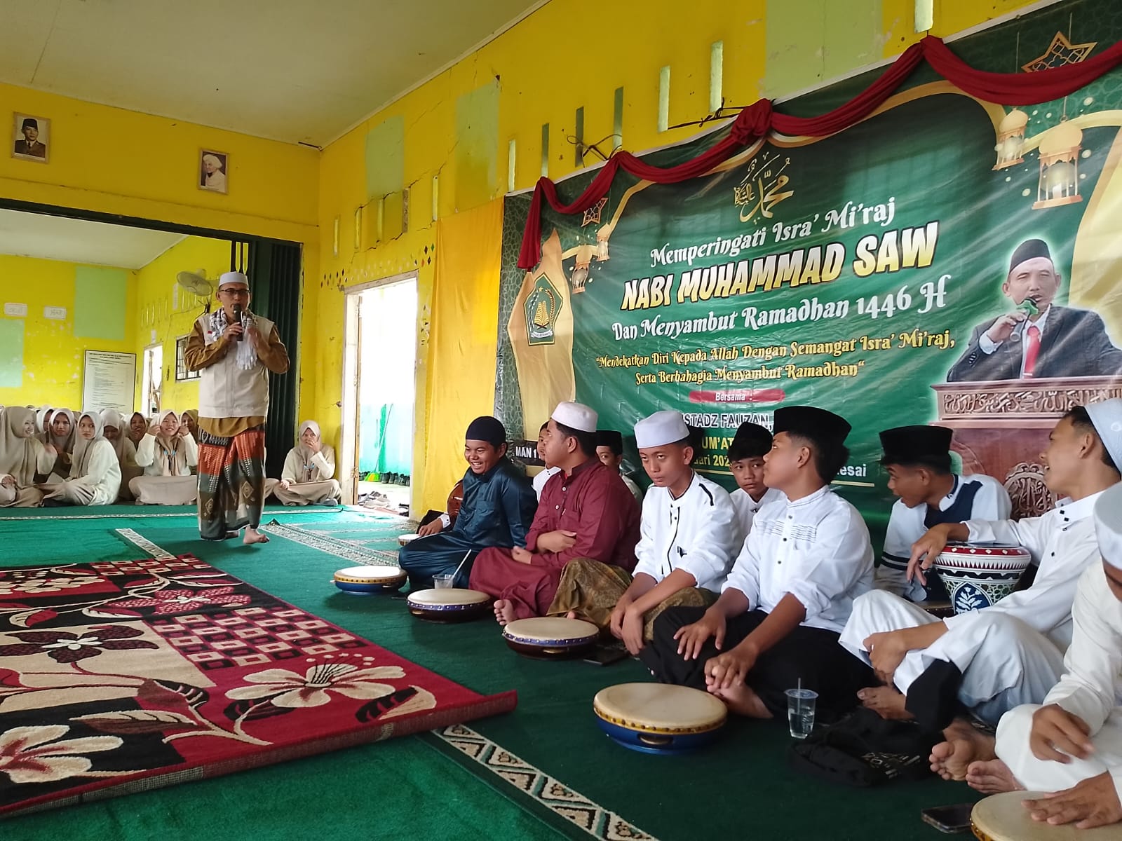 Jambi – Madrasah Aliyah Negeri (MAN) 1 Kota Jambi menggelar peringatan Isra’ Mi’raj Nabi Muhammad SAW dan Menyambut Ramadhan 1446 H dengan penuh hikmat di aula madrsah pada Jum’at 21 Februari 2025. Acara ini dihadiri oleh kepala madrasah, wakil kepala madrasah, dewan guru, siswa-siswi, serta tamu undangan Ustaz Fauzan, S.Pd.I