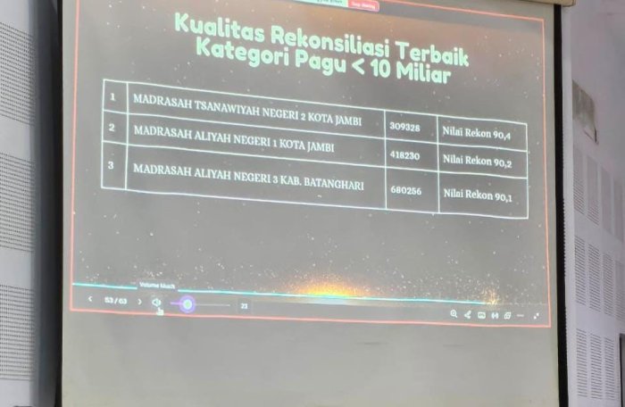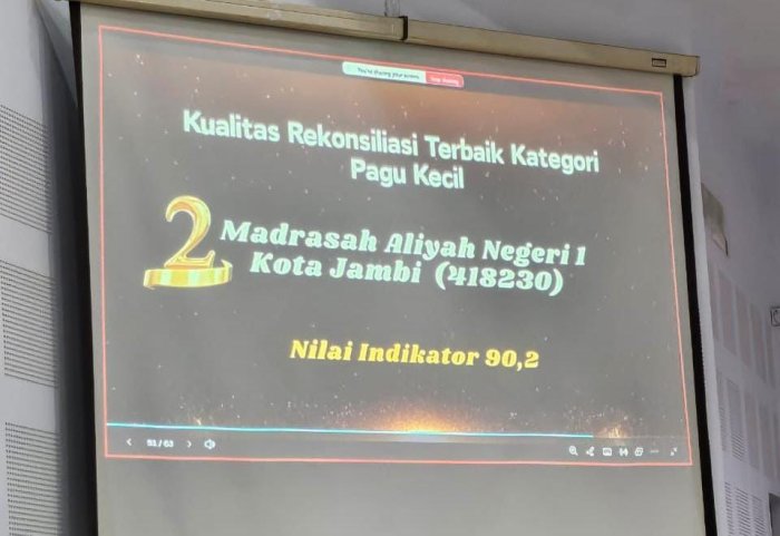 Kota Jambi (Humas) - MAN 1 Kota Jambi kembali menorehkan prestasi membanggakan, kali ini bukan dari bidang akademik, melainkan dari aspek tata kelola administrasi keuangan. Madrasah ini berhasil meraih Peringkat Kedua Kategori Kualitas Rekonsiliasi Terbaik untuk satuan kerja pagu kecil dalam evaluasi yang digelar oleh KPPN Jambi, Rabu (18/02).